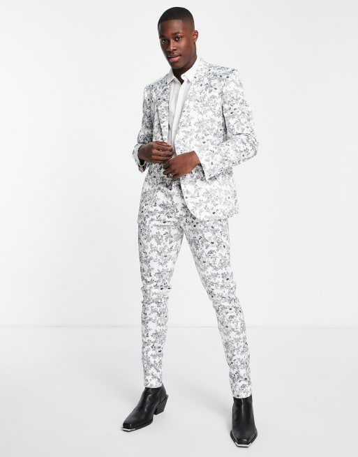 ASOS DESIGN – Czarno-biały garnitur jednorzędowy o obcisłym kroju w żakardowe kwiaty