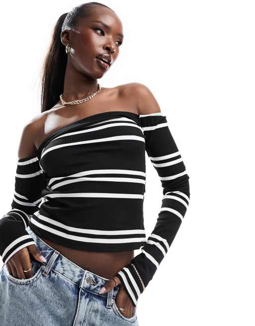 ASOS DESIGN – Czarno-biały top w paski z długimi rękawami i odsłoniętymi ramionami