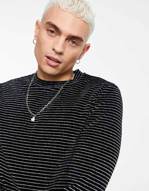 ASOS DESIGN – Czarno-srebrny obcisły T-shirt w paski z długimi rękawami