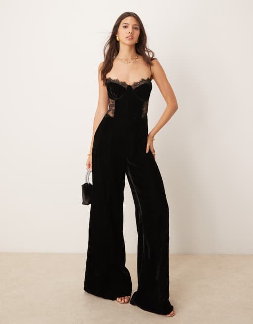 ASOS DESIGN – Czarny aksamitny kombinezon na ramiączkach z koronkową wstawką