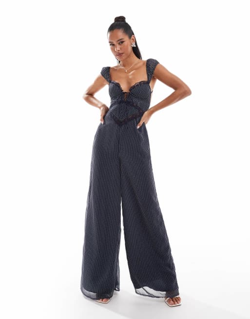 ASOS DESIGN – Czarny gorsetowy kombinezon w groszki z szerokimi nogawkami i koronkowymi wstawkami