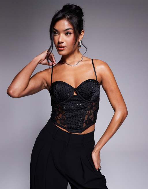 ASOS DESIGN – Czarny gorsetowy top z koronkowymi wstawkami i usztywnianymi miseczkami z dżetami