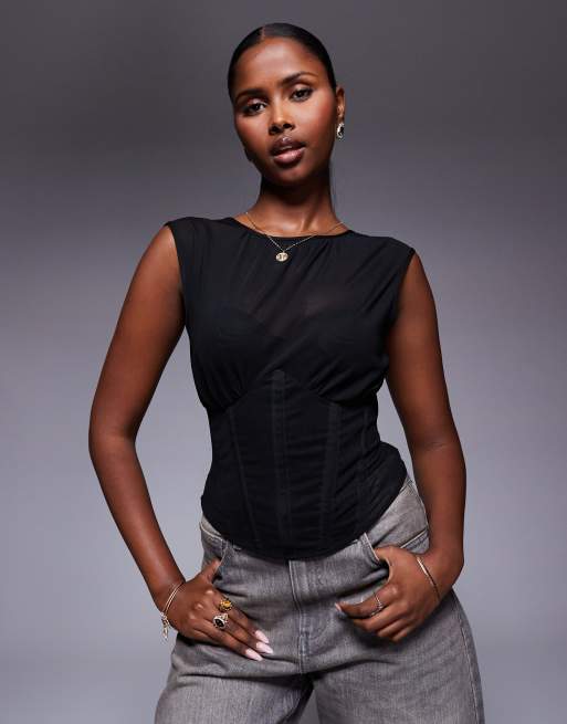 ASOS DESIGN – Czarny gorsetowy top z siateczkowymi wstawkami i drapowaniem