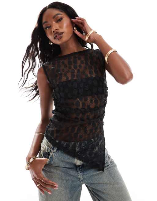 ASOS DESIGN – Czarny koronkowy top o asymetrycznym kroju z kwiatowym wzorem