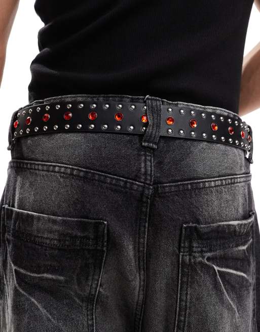 ASOS DESIGN – Czarny pasek z imitacji skóry z ćwiekami i czerwonymi kryształkami