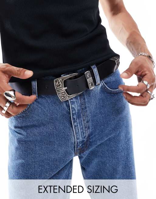 ASOS DESIGN – Czarny pasek z imitacji skóry z klamrą w kowbojskim stylu w kolorze srebra