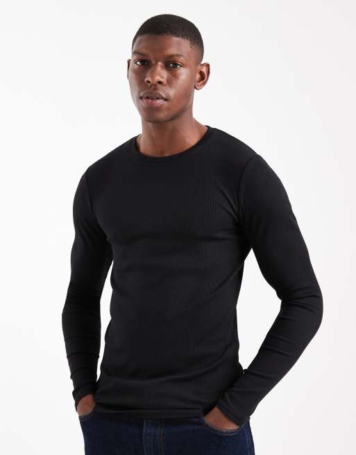 ASOS DESIGN – Czarny prążkowany T-shirt basic o kroju podkreślającym sylwetkę z długimi rękawami