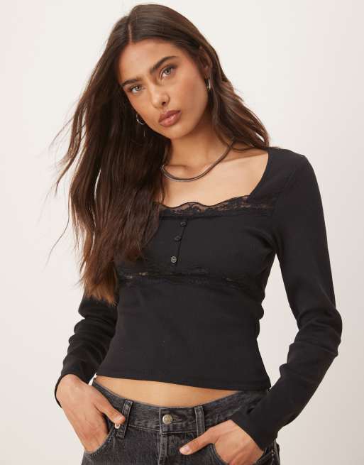 ASOS DESIGN – Czarny prążkowany top z długimi rękawami, guzikami i koronką