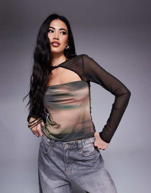ASOS DESIGN – Czarny siateczkowy top z długimi rękawami, ozdobnymi guzikami i abstrakcyjnym wzorem