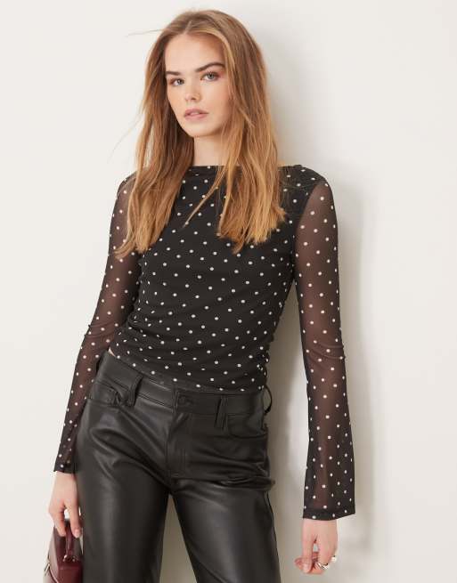 ASOS DESIGN – Czarny siateczkowy top z rozkloszowanymi rękawami w groszki