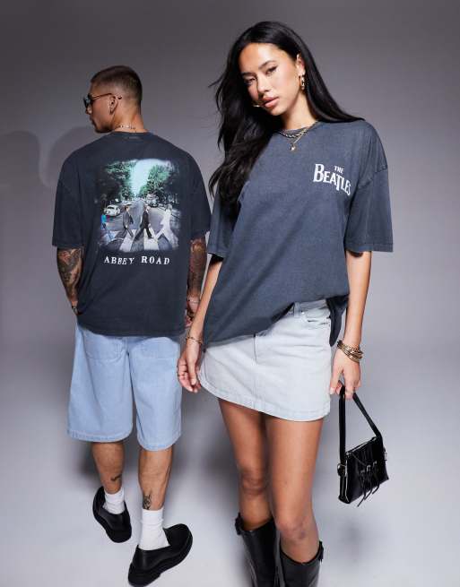ASOS DESIGN – Czarny sprany T-shirt oversize unisex z licencjonowanym nadrukiem The Beatles Abbey Road