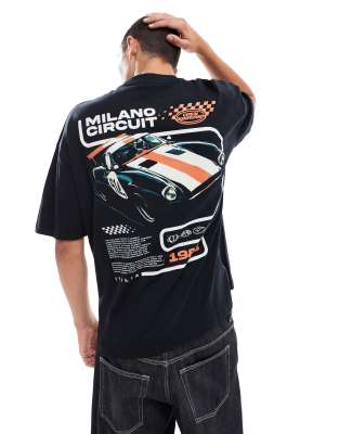 ASOS DESIGN – Czarny T-shirt oversize z nadrukiem samochodu wyścigowego z przodu i na plecach