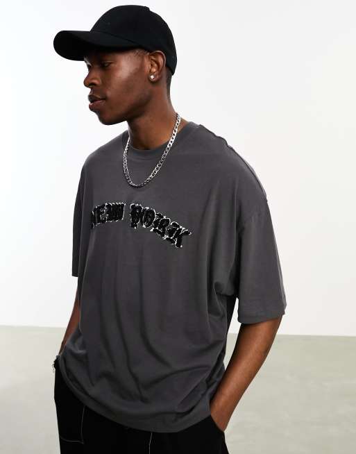 ASOS DESIGN – Czarny T-shirt oversize z naszywką New York z dzianiny boucle