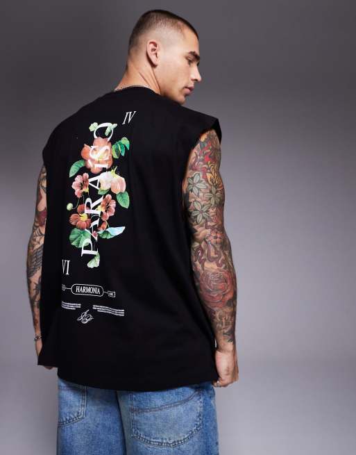 ASOS DESIGN – Czarny top bez rękawów oversize, z kwiatowym nadrukiem z napisem