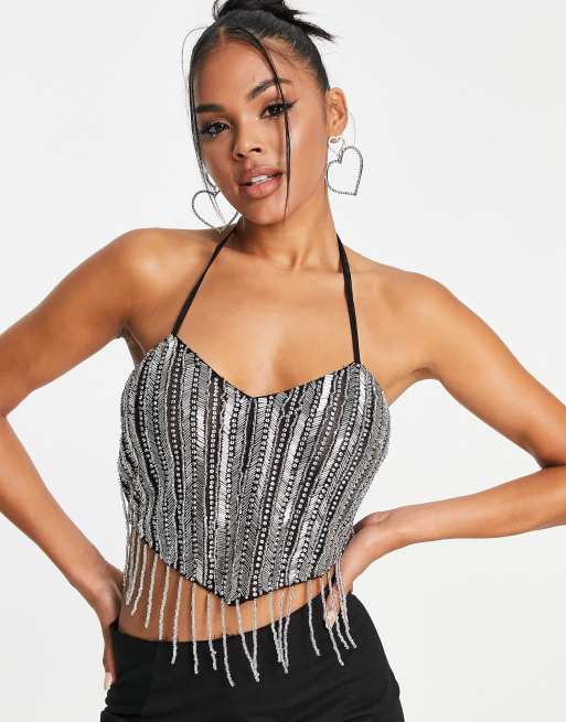 ASOS DESIGN – Czarny top z dekoltem typu halter z ozdobnymi frędzlami