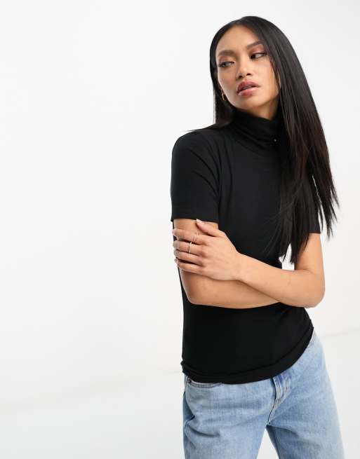 ASOS DESIGN – Czarny top z golfem i krótkimi rękawami z dzianiny o delikatnym splocie