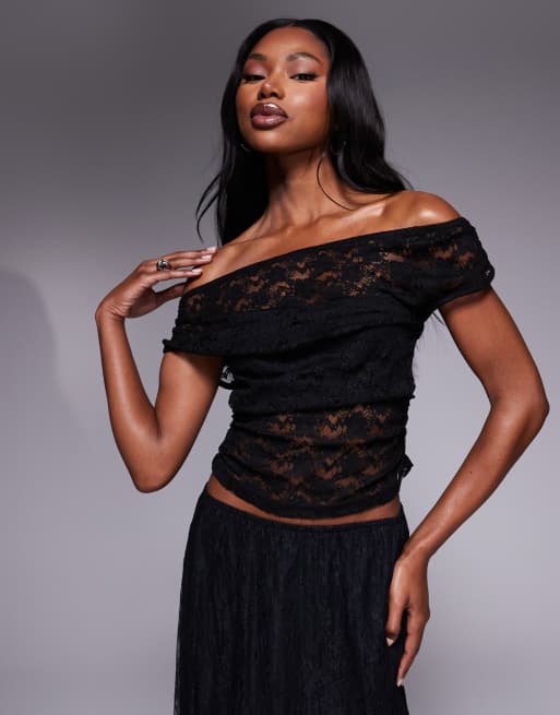 ASOS DESIGN – Czarny zbierany po bokach top koronkowy z odsłoniętymi ramionami