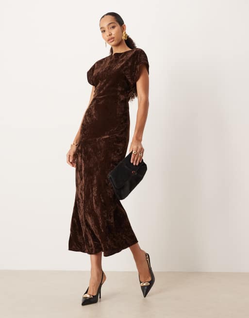 ASOS DESIGN – Czekoladowa aksamitna sukienka midi z krótkimi rękawami i okrągłym dekoltem