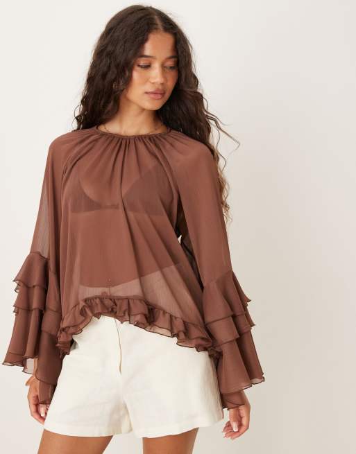 ASOS DESIGN – Czekoladowa długa bluzka szyfonowa z falbanką