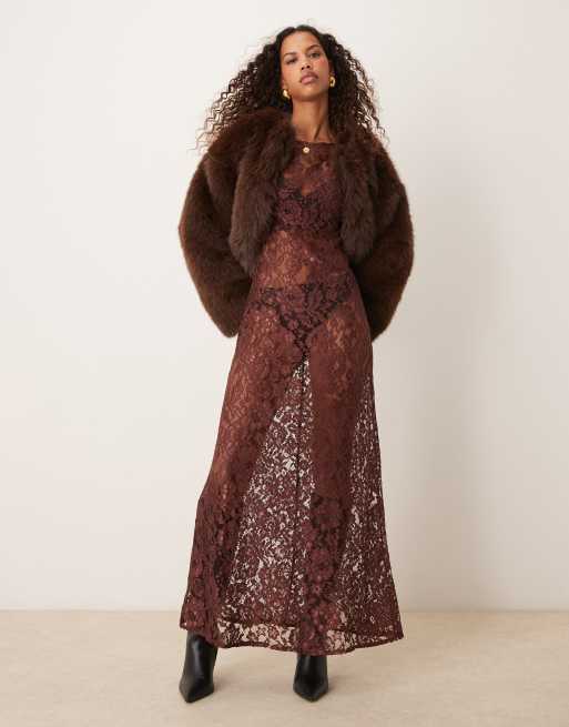 ASOS DESIGN – Czekoladowa koronkowa sukienka maxi z rozkloszowanymi rękawami