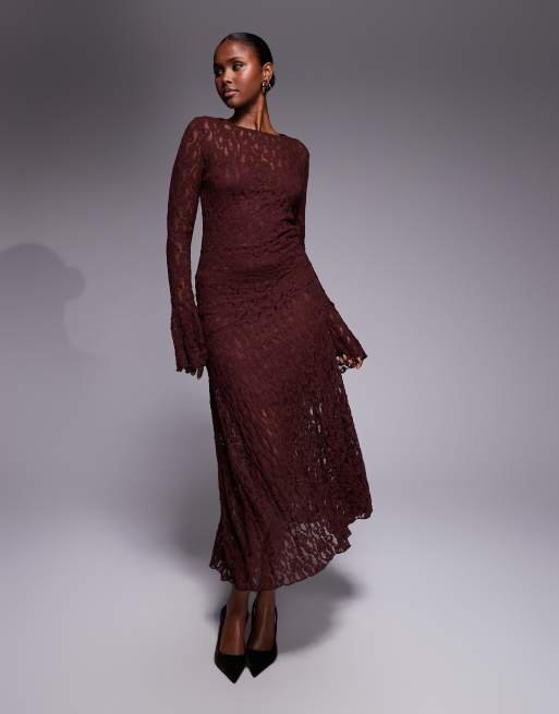 ASOS DESIGN – Czekoladowa koronkowa sukienka midi z długimi rękawami i asymetrycznym dołem