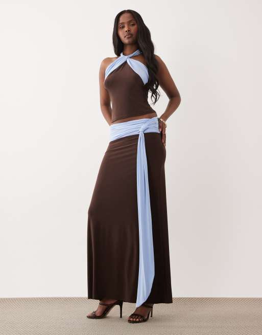 ASOS DESIGN – Czekoladowa miękka spódnica maxi z kontrastową szarfą w talii, część zestawu