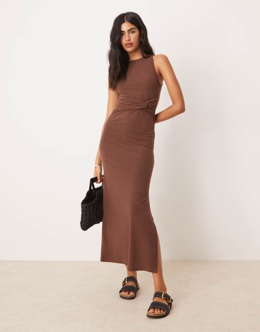 ASOS DESIGN – Czekoladowa prążkowana spódnica midi bez rękawów z węzłem w talii
