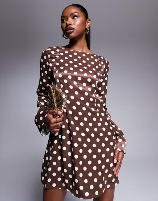 ASOS DESIGN – Czekoladowa satynowa sukienka mini w groszki z rozkloszowanymi rękawami