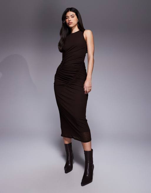ASOS DESIGN – Czekoladowa siateczkowa sukienka midi bez rękawów z marszczeniem