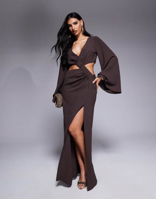 ASOS DESIGN – Czekoladowa sukienka maxi z długimi rękawami i wycięciem