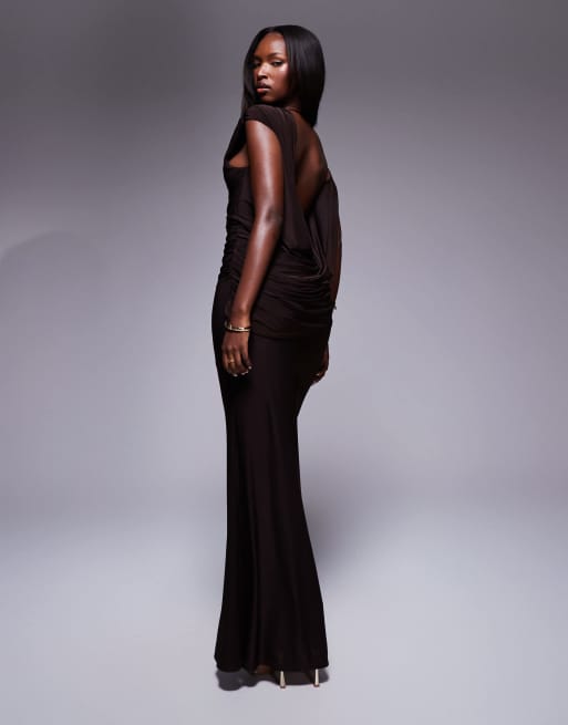 ASOS DESIGN – Czekoladowa sukienka maxi z odsłoniętym ramieniem i drapowanym tyłem