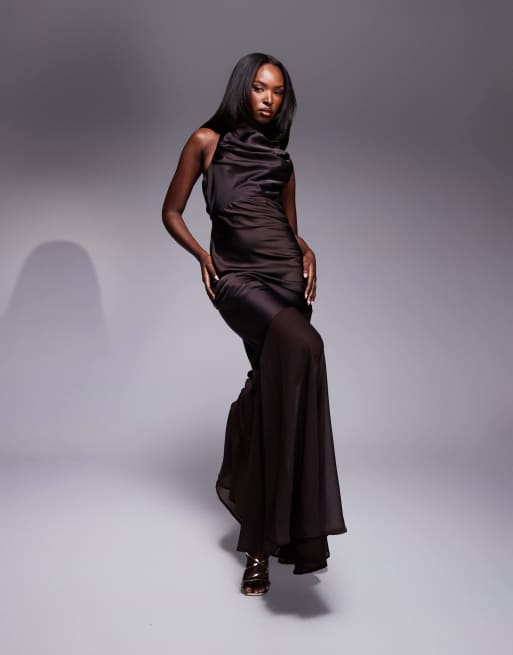 ASOS DESIGN – Czekoladowa sukienka maxi z satyny i szyfonu z drapowanym odkrytym tyłem