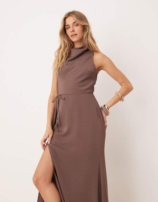 ASOS DESIGN – Czekoladowa sukienka midi z drapowaną spódnicą i zabudowanym dekoltem