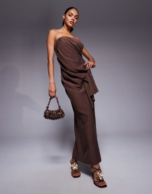 ASOS DESIGN – Czekoladowa sukienka mini z dekoltem bandeau i zakładkami po bokach