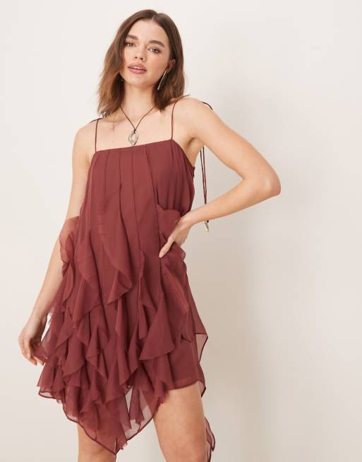 ASOS DESIGN – Czekoladowobrązowa sukienka mini z wiązanymi ramiączkami i falbankami