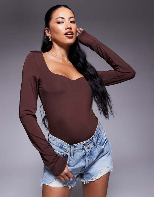 ASOS DESIGN – Czekoladowobrązowy dwuwarstwowy top z długimi rękawami i dekoltem w kształcie zagiętej litery U