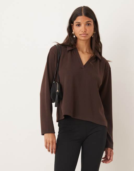 ASOS DESIGN – Czekoladowobrązowy dzianinowy top z kołnierzem w stylu rugby z długimi rękawami