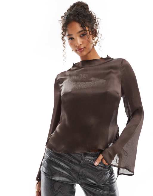 ASOS DESIGN – Czekoladowobrązowy top z rozkloszowanymi rękawami i drapowanym dekoltem