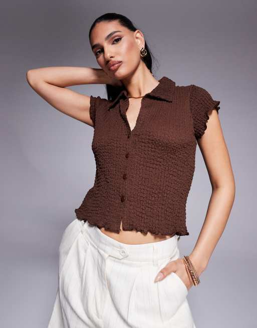 ASOS DESIGN – Czekoladowy fakturowany top zapinany na guziki z krótkimi rękawami