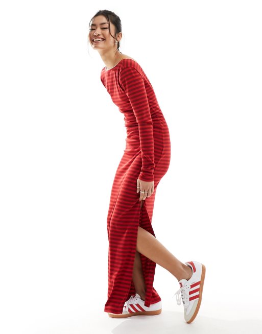 ASOS DESIGN – Czerwona sukienka maxi w paski z dekoltem w kształcie litery U na plecach