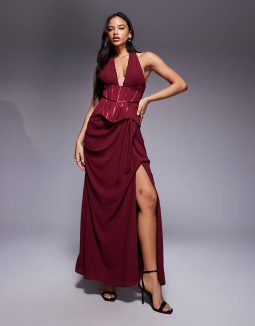 ASOS DESIGN – Czerwona sukienka maxi z usztywniana gorsetową talią i dekoltem typu halter