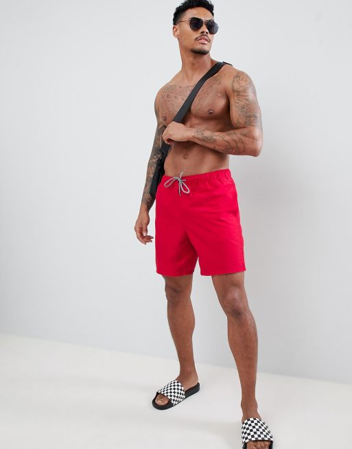 ASOS DESIGN – Czerwone szorty kąpielowe o średniej długości z czarno-białymi troczkami