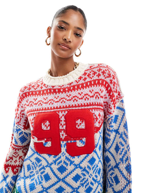 ASOS DESIGN – Czerwono-niebieski świąteczny sweter oversize w patchworkowy wzór skandynawski