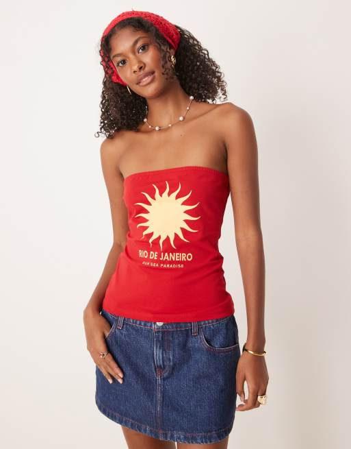 ASOS DESIGN – Czerwony top bandeau o wydłużonym fasonie z wakacyjną grafiką ze słońcem