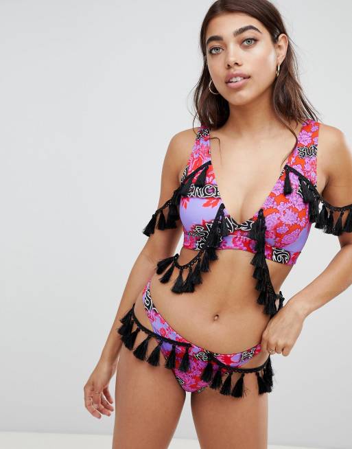 ASOS DESIGN –Dół od bikini typu tanga z żywiołowym nadrukiem i frędzelkami