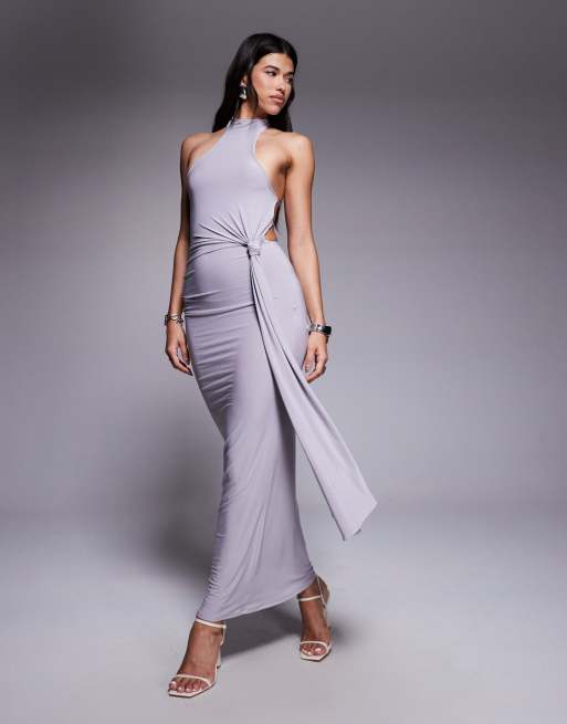 ASOS DESIGN – Dopasowana łupkowoszara sukienka maxi z węzłem z przodu i drapowanym dekoltem