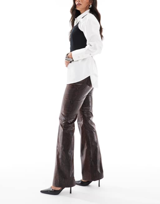 ASOS DESIGN – Dopasowane brązowe spodnie z rozszerzanymi nogawkami z imitacji skóry węża