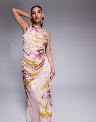 ASOS DESIGN – Drapowana asymetryczna sukienka maxi z odkrytymi plecami w duży kwiatowy wzór