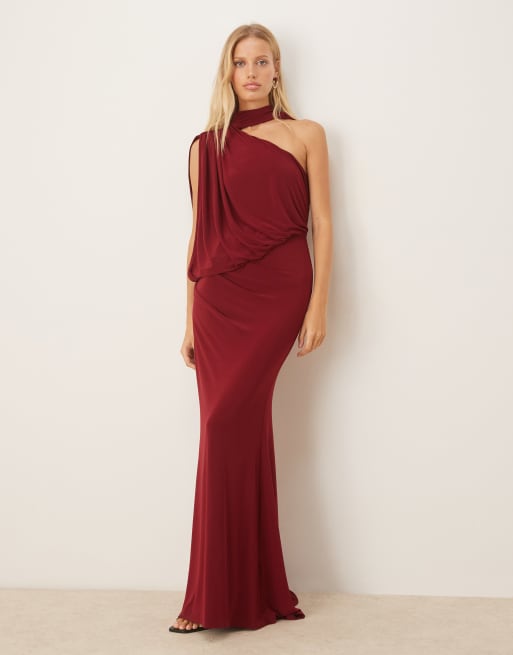 ASOS DESIGN – Drapowana ciemnoczerwona sukienka maxi na jedno ramię z drapowaniem i pelerynką