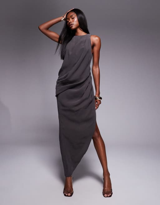 ASOS DESIGN – Drapowana grafitowa sukienka maxi z asymetrycznym dołem